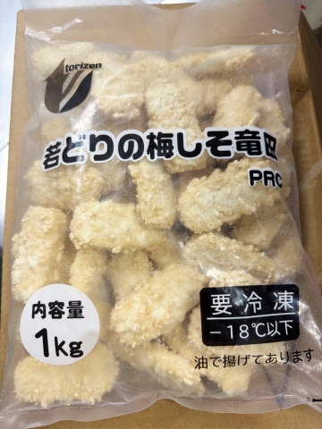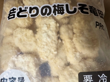 鶏肉、小麦粉、でん粉、植物油脂、梅ペースト、大豆たん白、米粉、パン粉、食塩、青しそ、砂糖、酵母エキス、香辛料/調味料(アミノ酸)、加工澱粉、リン酸塩(Na)、膨張剤、増粘多糖類、(一部に小麦・大豆・鶏肉を含む)