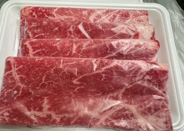 九州産の交雑牛モモをスライス後、1枚~2枚ずつ食品シートに包んだ加工をしております。